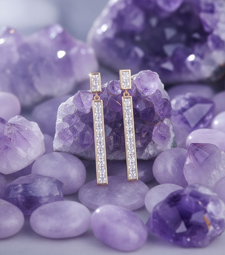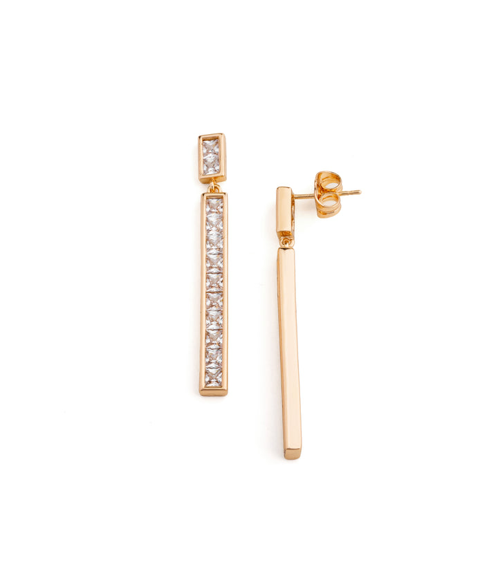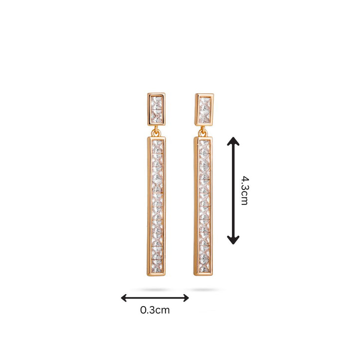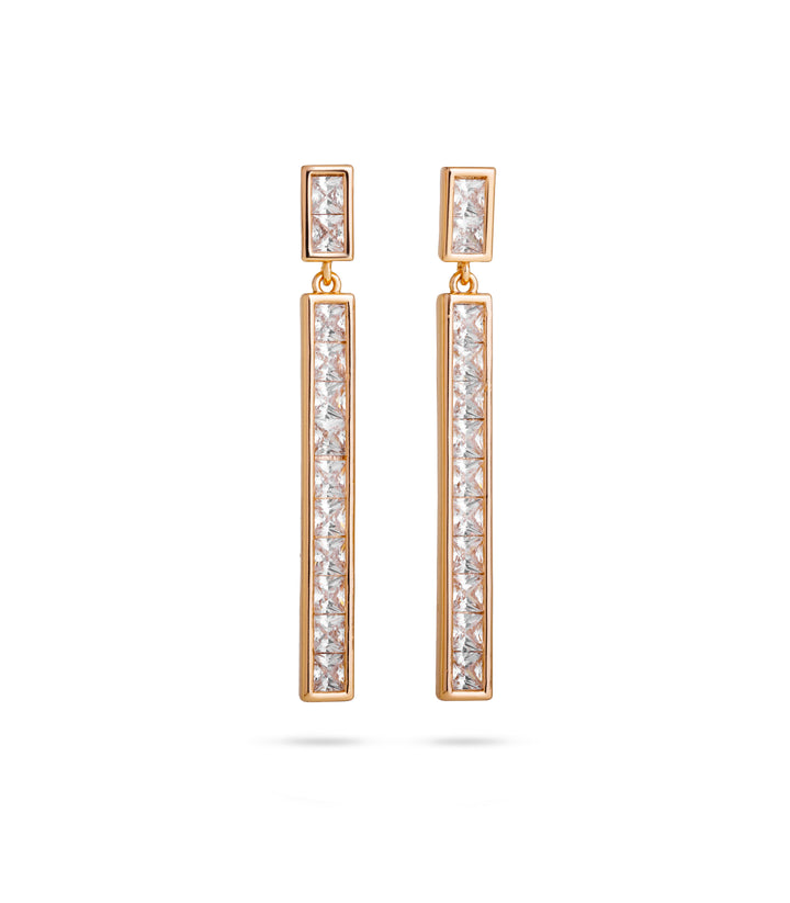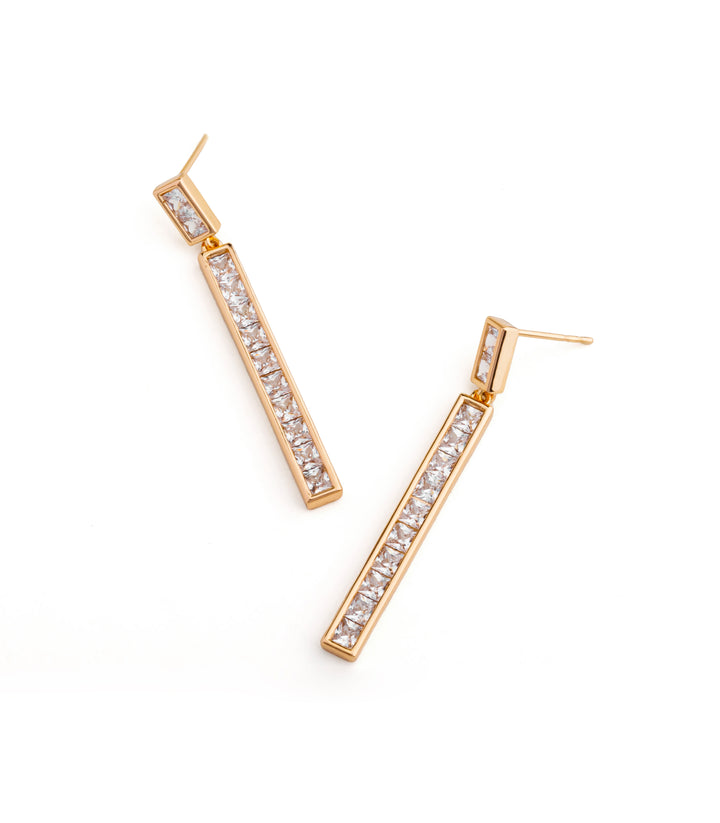 Sleek danglers featuring a thin bar adorned with diamond-like studs. A minimalist yet striking pair that adds subtle sparkle to any look.