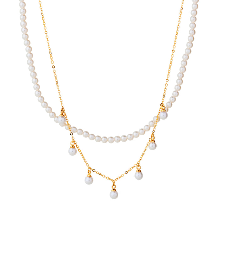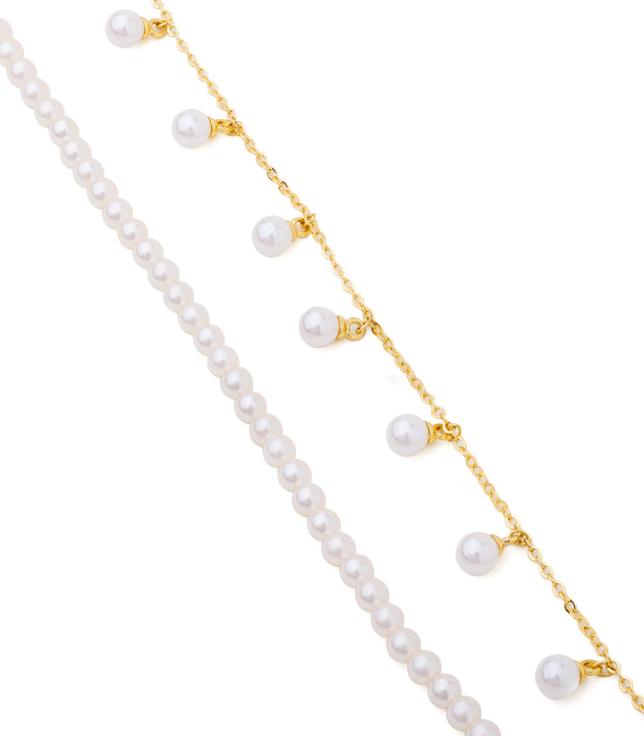 A charming two-layer design, one strand fully pearled and the other delicately dotted with hanging pearls. The contrast creates a soft yet striking look that feels timeless. Wear it with a simple neckline to let the pearls stand out or layer it with gold chains for a modern twist.