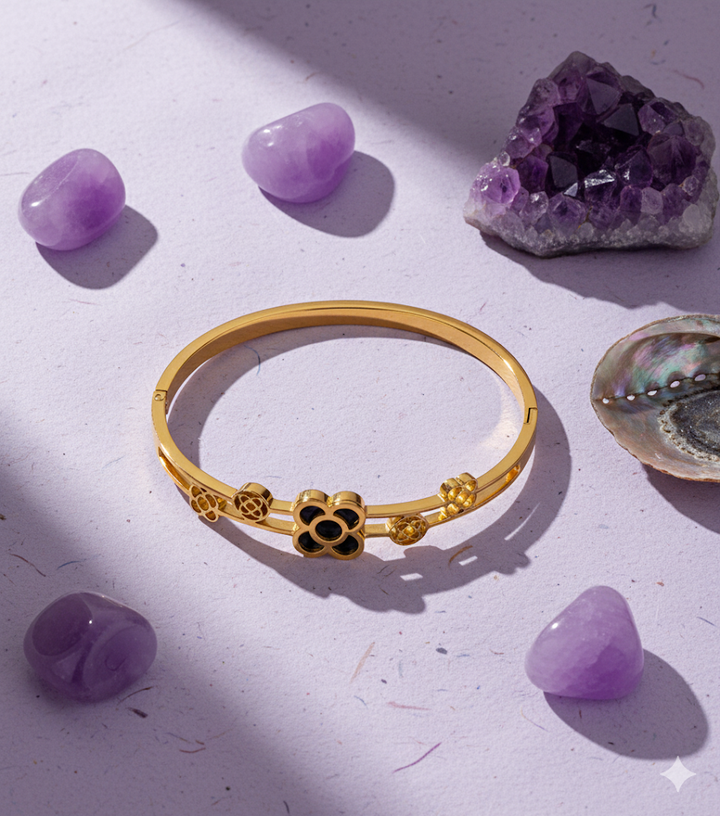 A graceful bangle adorned with delicate flower patterns, blending elegance with a modern edge. Chic, unique, and effortlessly stylish.
