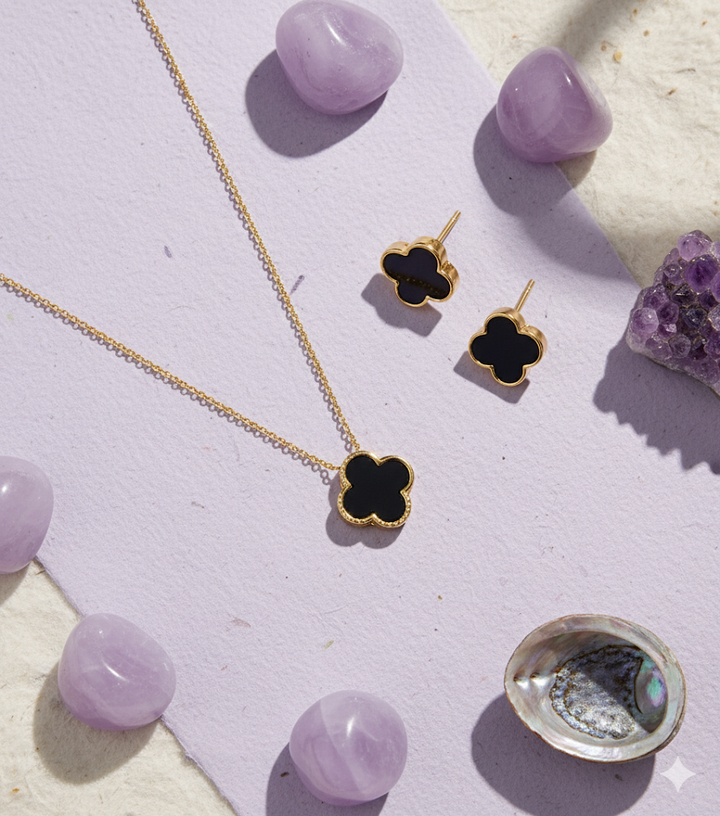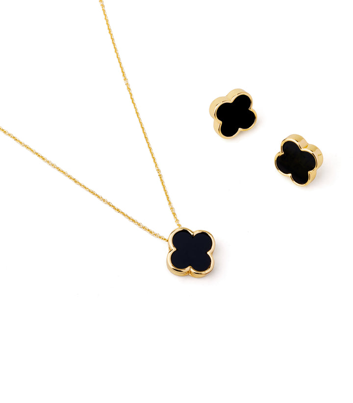 A bold yet refined set featuring a sleek necklace with a black spade pendant, paired with matching earrings. Perfect for adding a touch of statement elegance to your look.