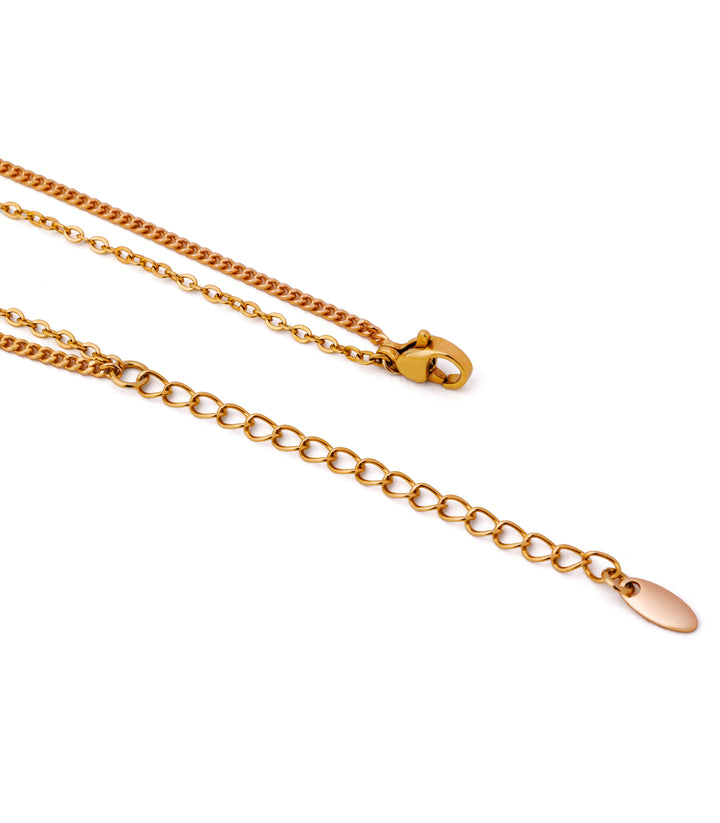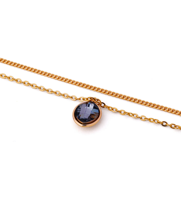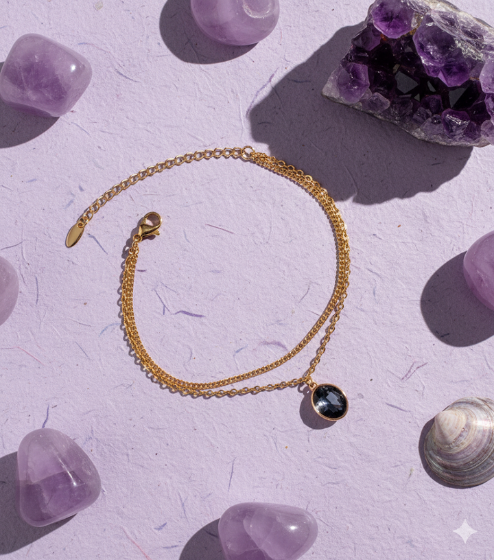 A delicate rose-gold bracelet featuring a striking black teardrop detail, looks the best with a black dress.