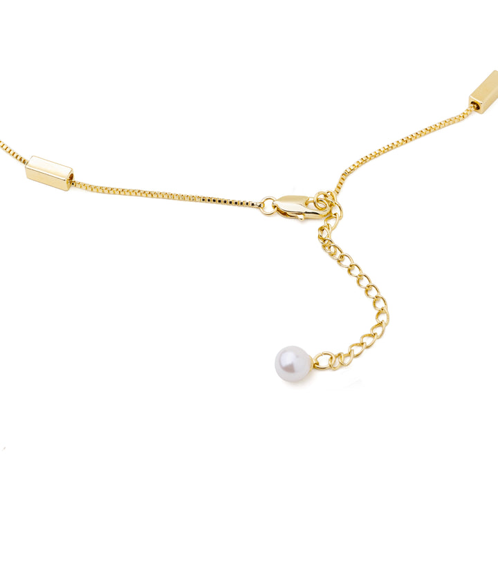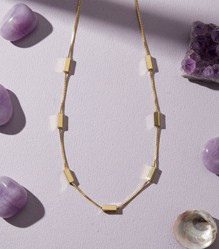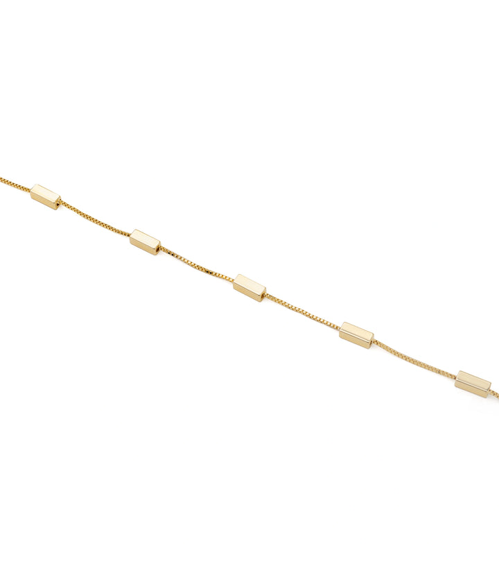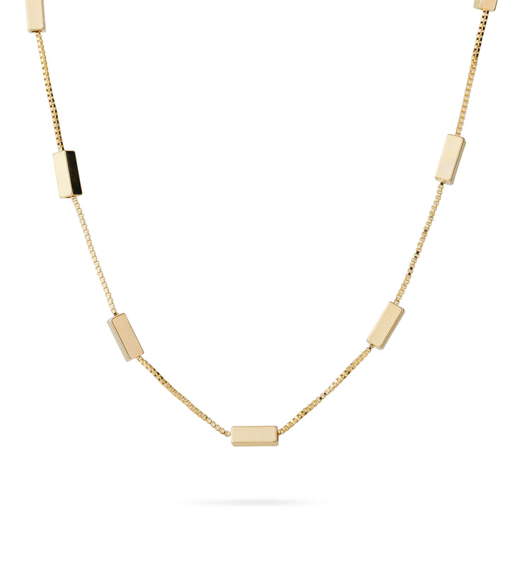 A sleek single chain accented with fine golden blocks placed throughout for a clean, modern finish. Its minimal geometry makes it versatile enough to wear every day while still adding a touch of edge. Pair it with structured outfits for a polished look or stack it with delicate chains for effortless layering.