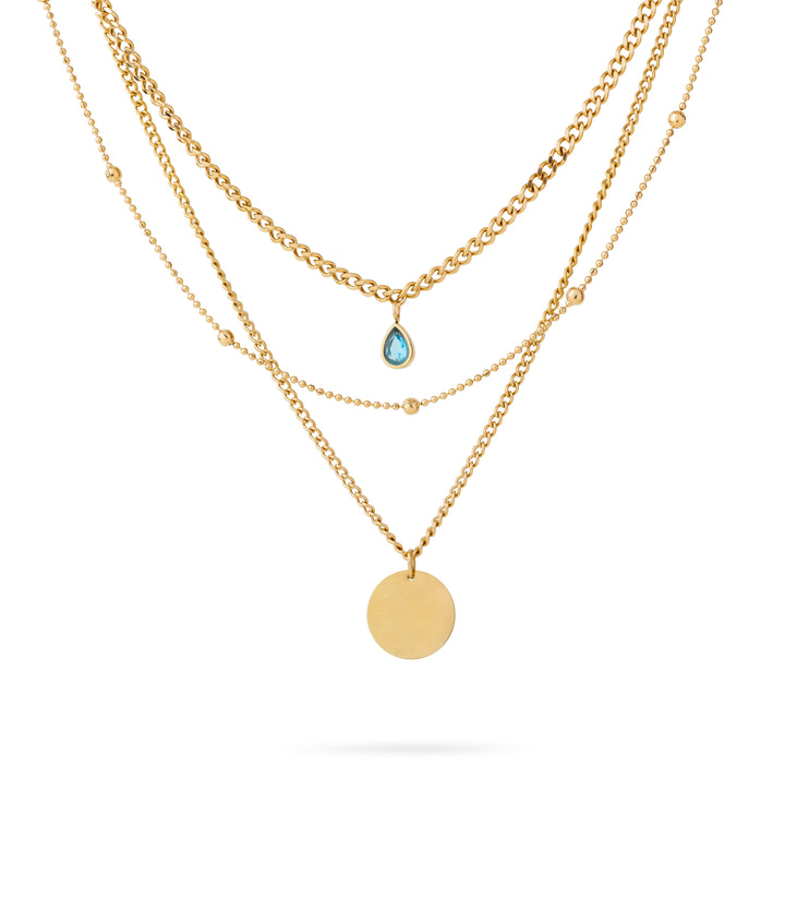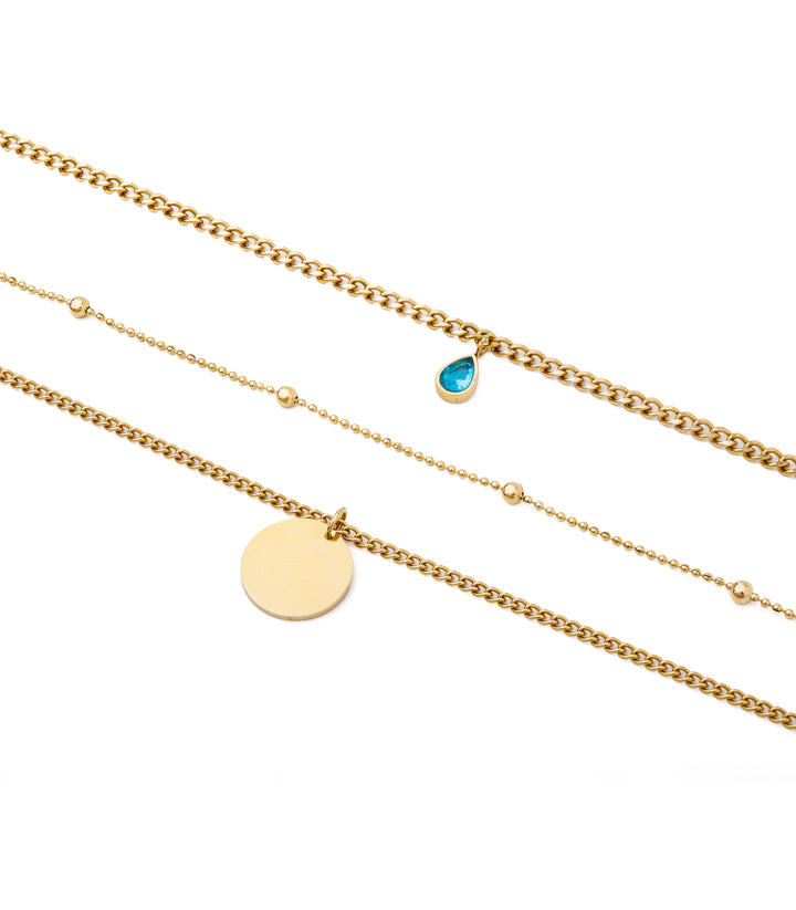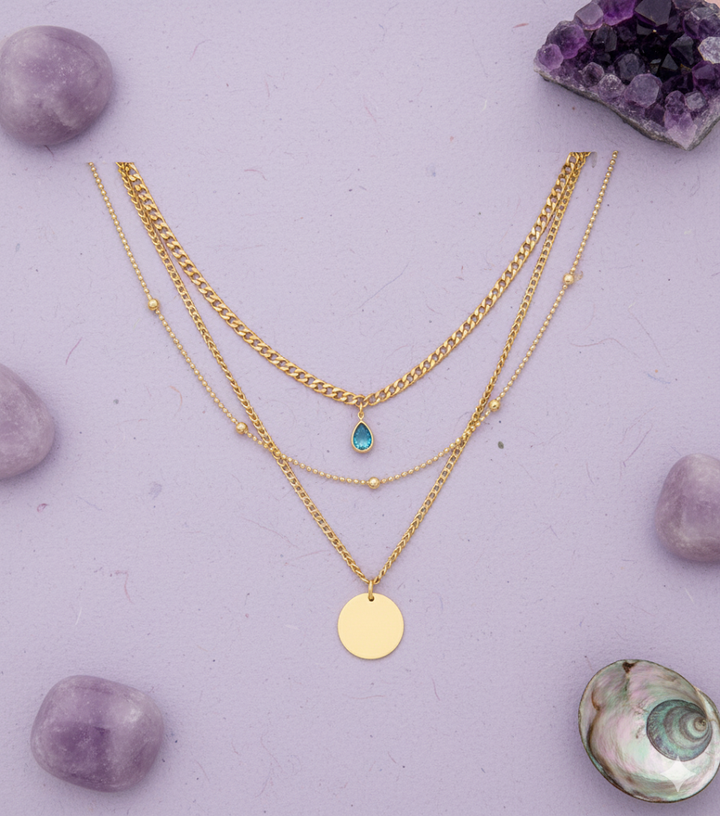 A delicate double-layered necklace, featuring a striking blue teardrop pendant as its highlight. The layered design adds depth and charm, making it an elegant statement for both everyday wear and special occasions. Its subtle pop of color brings a refreshing twist to your jewellery collection.