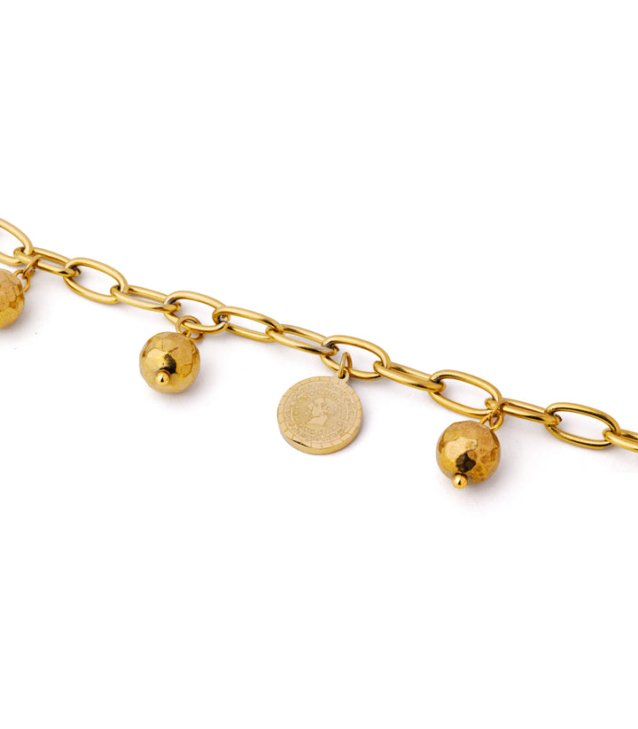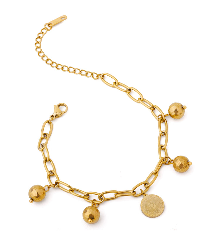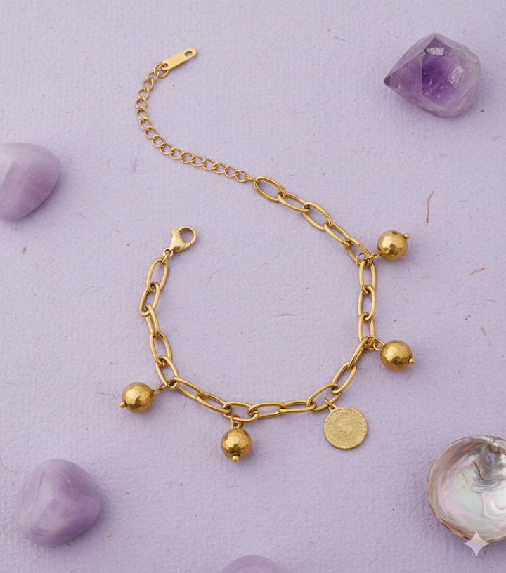 Delicate gold beads dangle from a fine link chain, adding playful charm to your wrist. Light, elegant, and perfect for everyday wear.
