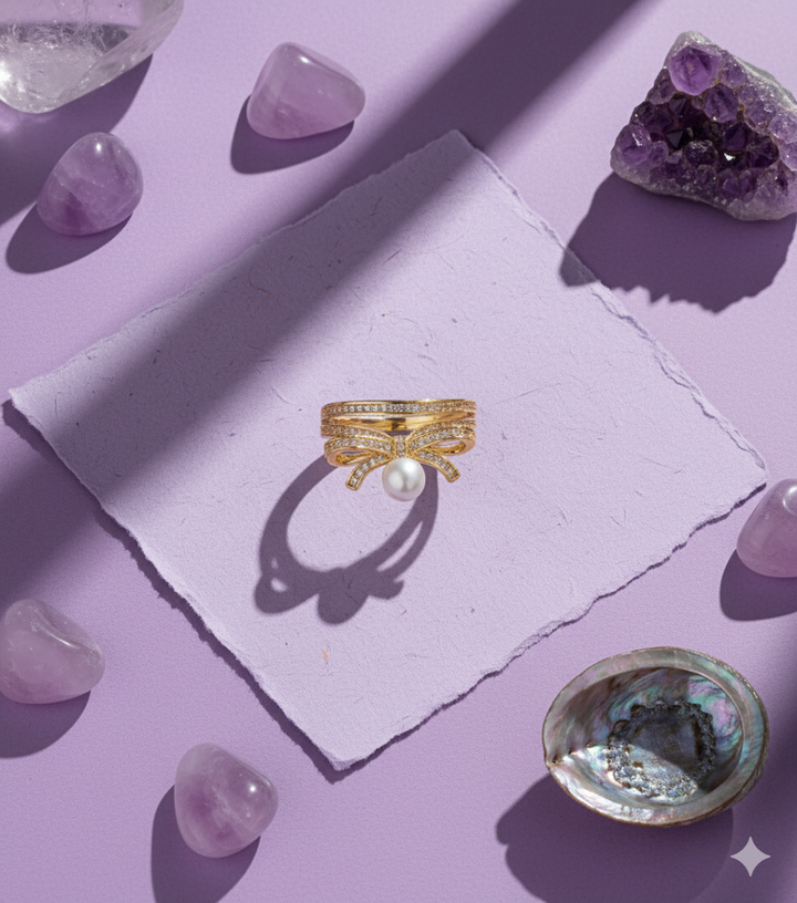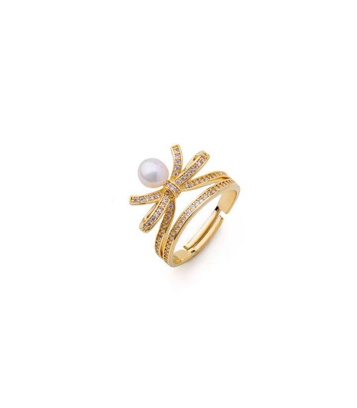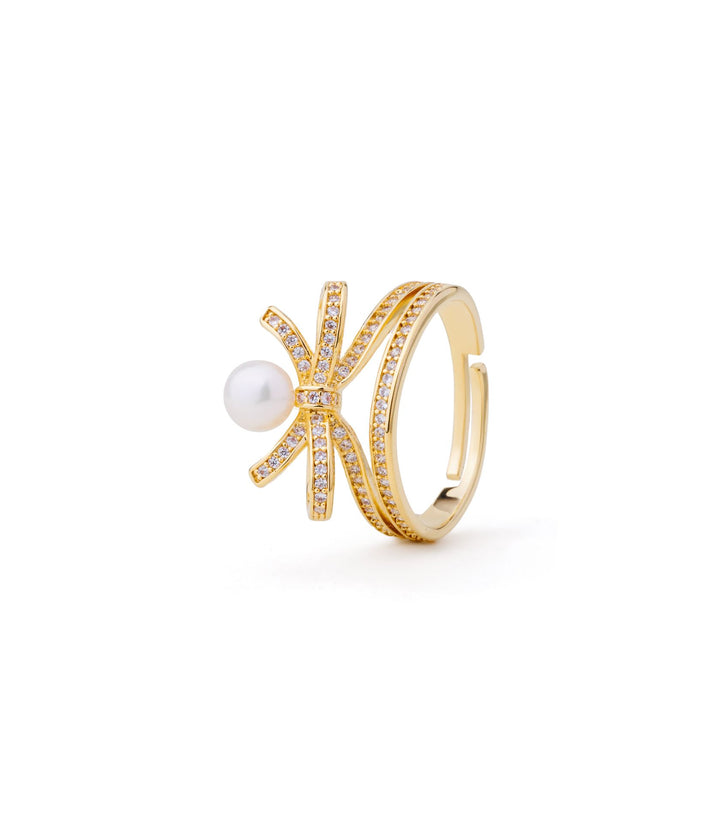 A cutesy ring with a bow and a pearl, perfect to pair with a dress.