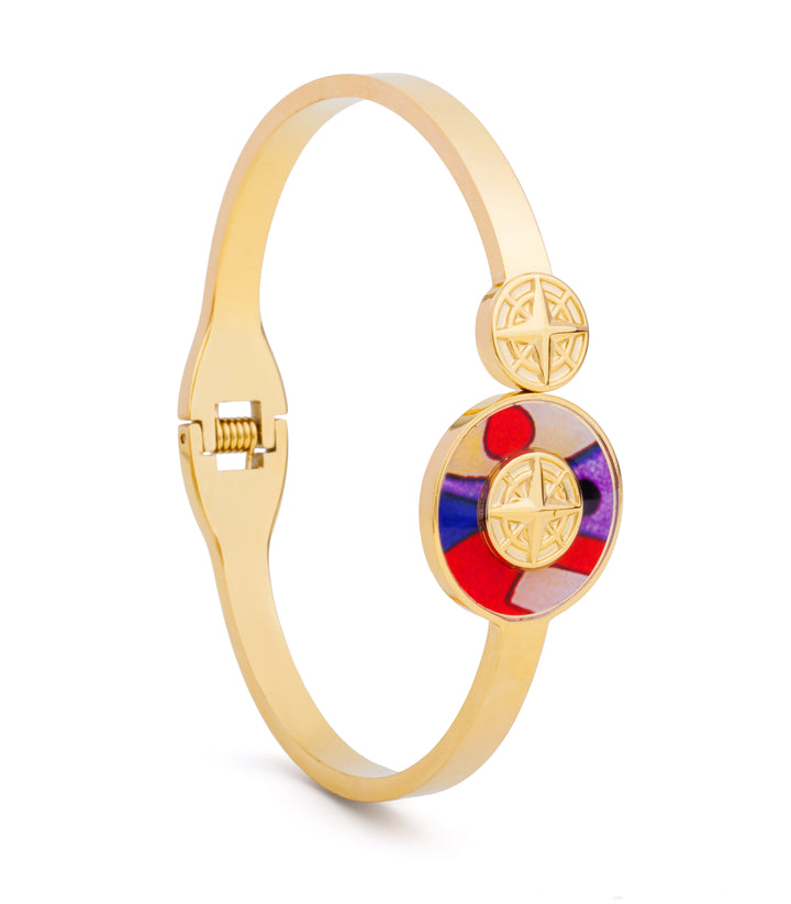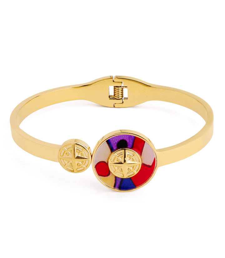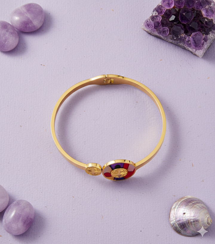 A vibrant round colorful centerpiece, bringing a playful pop to a classic bangle. Bright, fun, and effortlessly stylish.