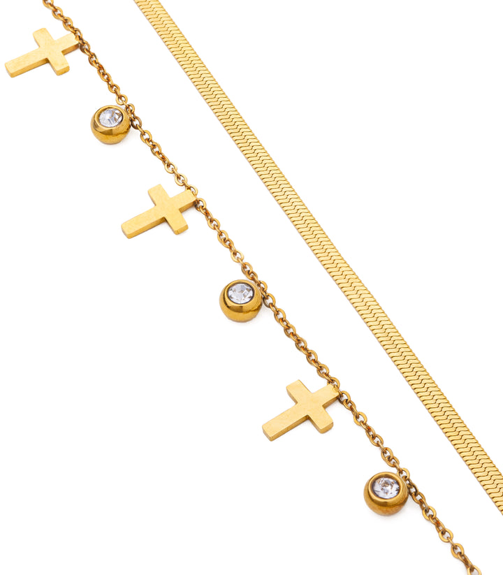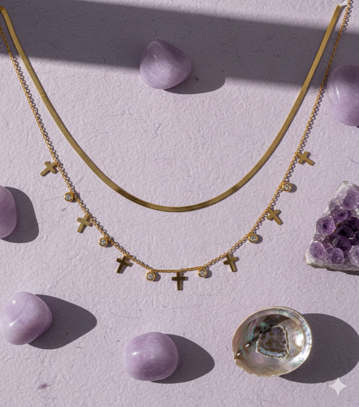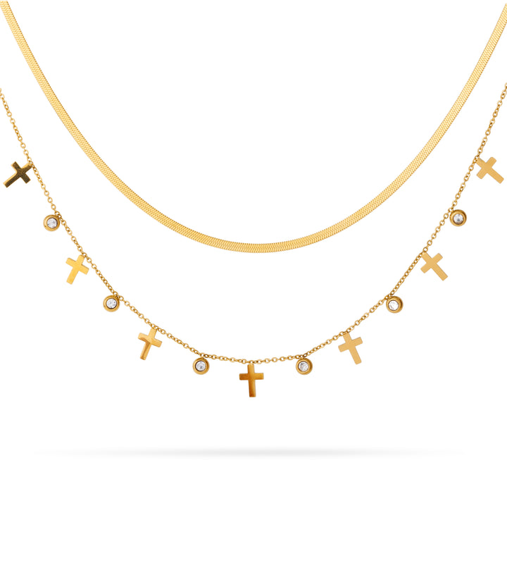 A thoughtful double-layered necklace featuring a classic cross pendant as its centerpiece. The layered design adds subtle depth, making it versatile for both casual and dressier outfits. Wear it alone for a simple, meaningful statement or pair it with delicate chains to enhance the layered effect.
