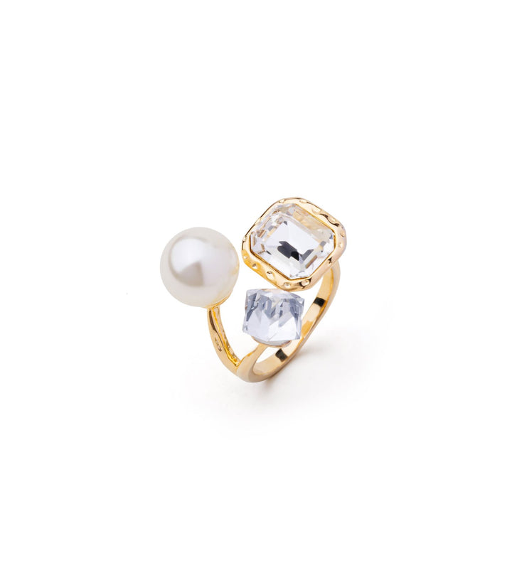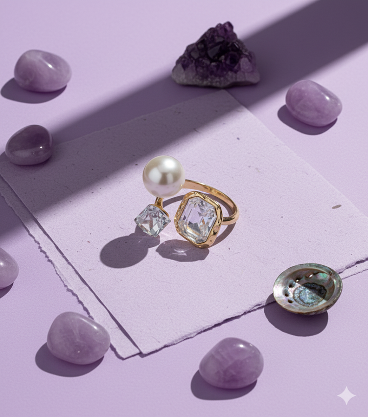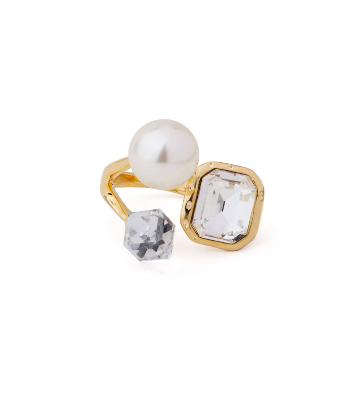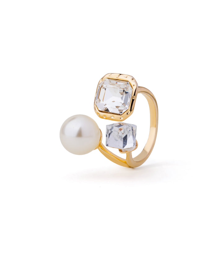 An open cuff design adorned with a radiant crystal on one end and a lustrous pearl on the other. Chic and balanced, it’s elegance with a modern twist.
