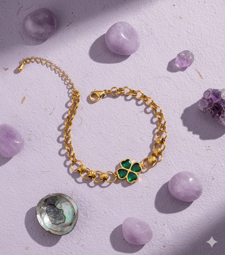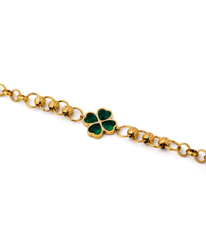 Celebrate simple beauty and positivity with this charming gold-toned bracelet, featuring a delicate chain and an eye-catching four-leaf clover centerpiece accented with rich green enamel. The playful yet elegant motif adds a hint of color and luck to your style, making it a perfect everyday accessory or a thoughtful gift. Designed with hypoallergenic and anti-tarnish materials, this bracelet combines joy and lasting comfort, ready to be cherished by anyone seeking a unique, meaningful touch in their jewelry collection.