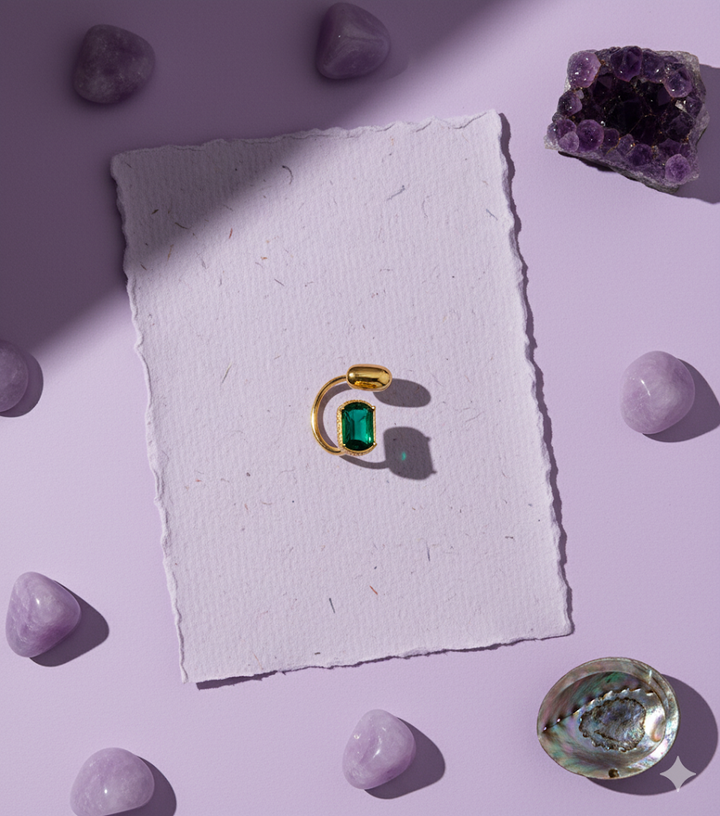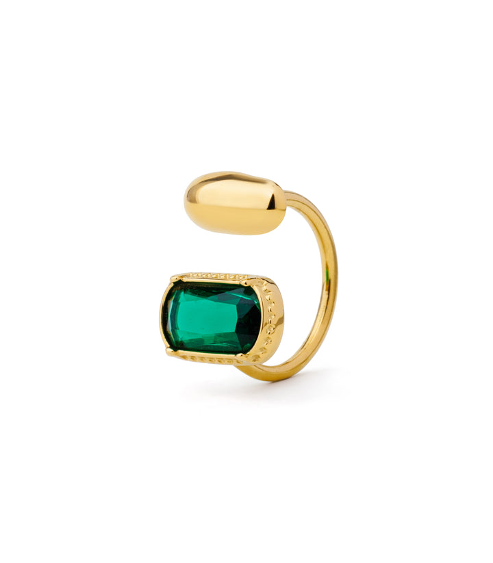 A beautiful emerald stone in a cuff ring, perfect for any evening look.