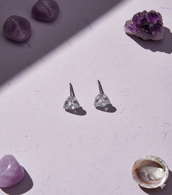 Geometric studs with a triangle shape, accented by diamond-like sparkle. A subtle yet stylish pair that fits seamlessly into both work and casual looks.
