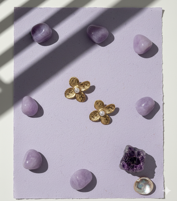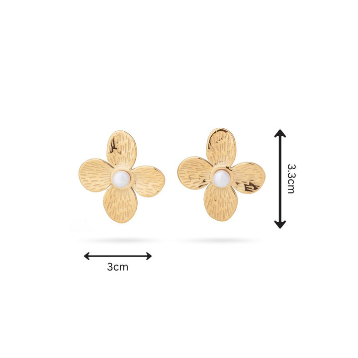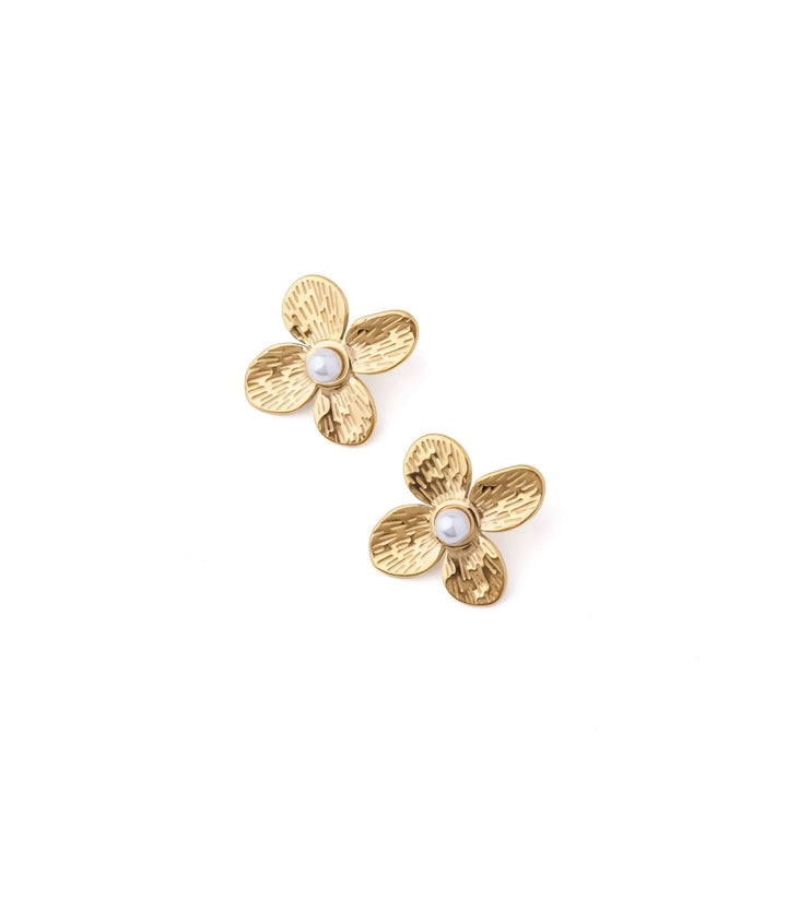 Delicate floral studs centered with a lustrous pearl, blending timeless grace with a soft feminine charm.
