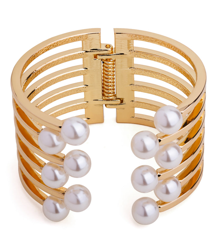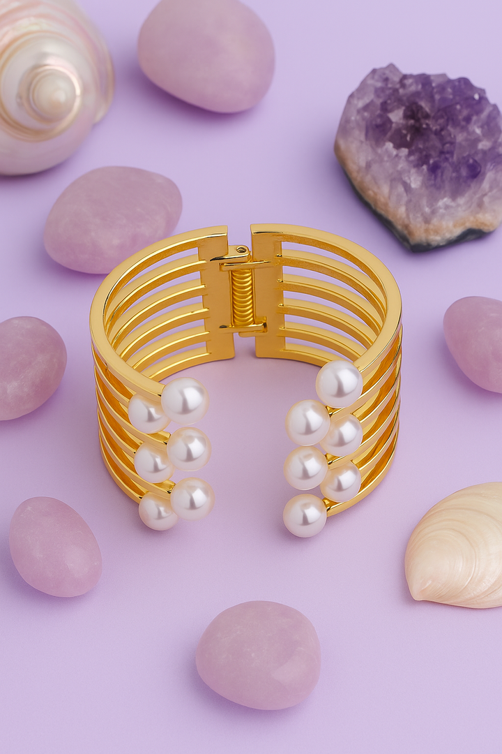 A chic cuff accented with luminous pearls, blending classic elegance with modern edge. Bold, graceful, and effortlessly stylish.