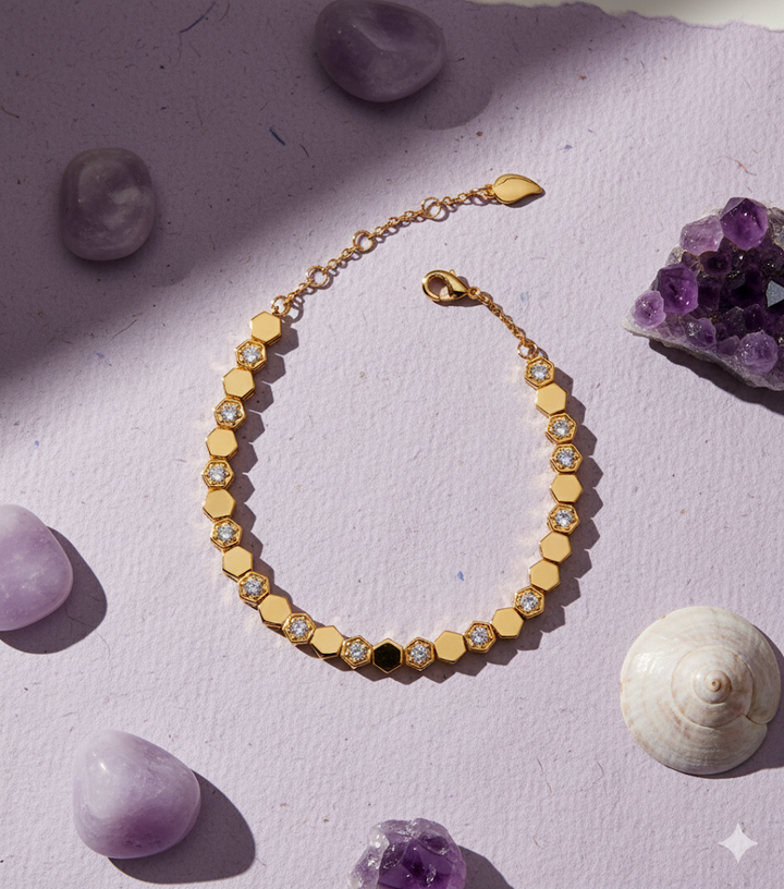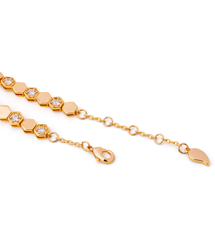 Elevate any look with this elegant gold-toned bracelet, thoughtfully designed with a graceful row of sparkling round-cut stones set in minimalist bezel settings. The delicate chain and adjustable closure ensure a comfortable and secure fit, making it perfect for everyday wear or special occasions. Whether styled solo or layered with other pieces, this timeless bracelet adds a touch of refined shimmer to your jewelry collection. Hypoallergenic and crafted to resist tarnish, it's ideal for those seeking both style and lasting quality.