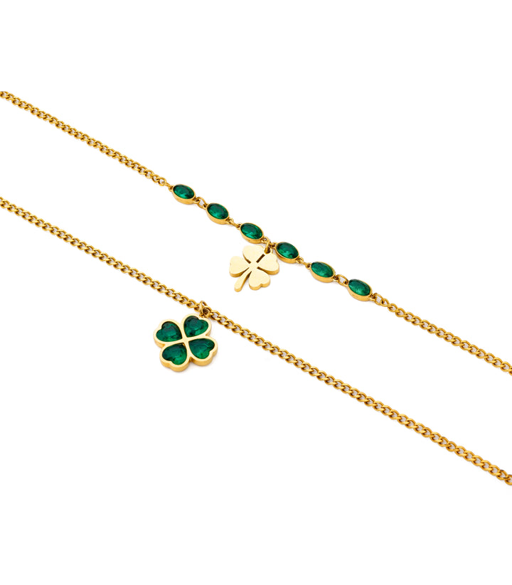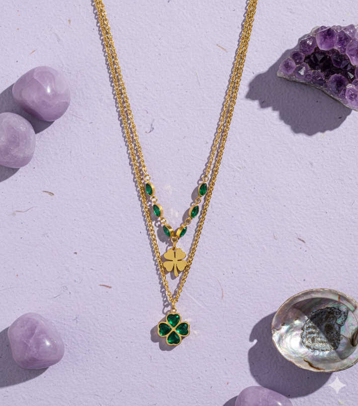 Elevate your look with this enchanting layered necklace featuring shimmering gold chains adorned with vibrant green stones and signature four-leaf clover charms. Each pendant symbolizes luck, hope, and positive energy while adding a playful yet refined accent to any outfit.
