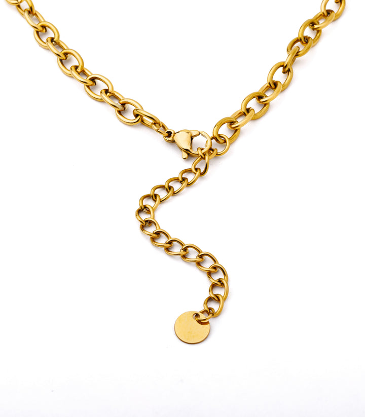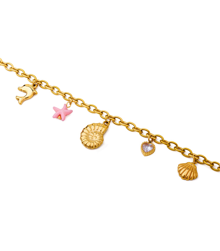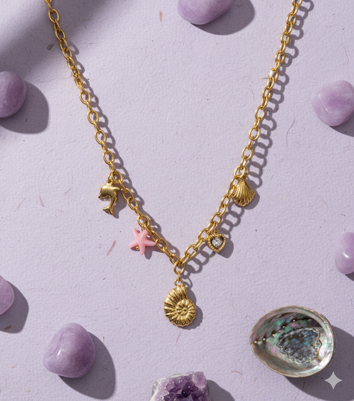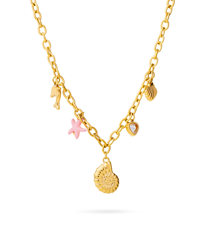 A playful statement piece featuring an array of charms. Its chunky design brings a fun, beachy vibe to any outfit. Perfect for layering over simple tops or making a statement on its own for a whimsical, summer-ready look.
