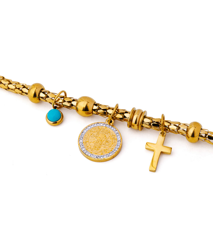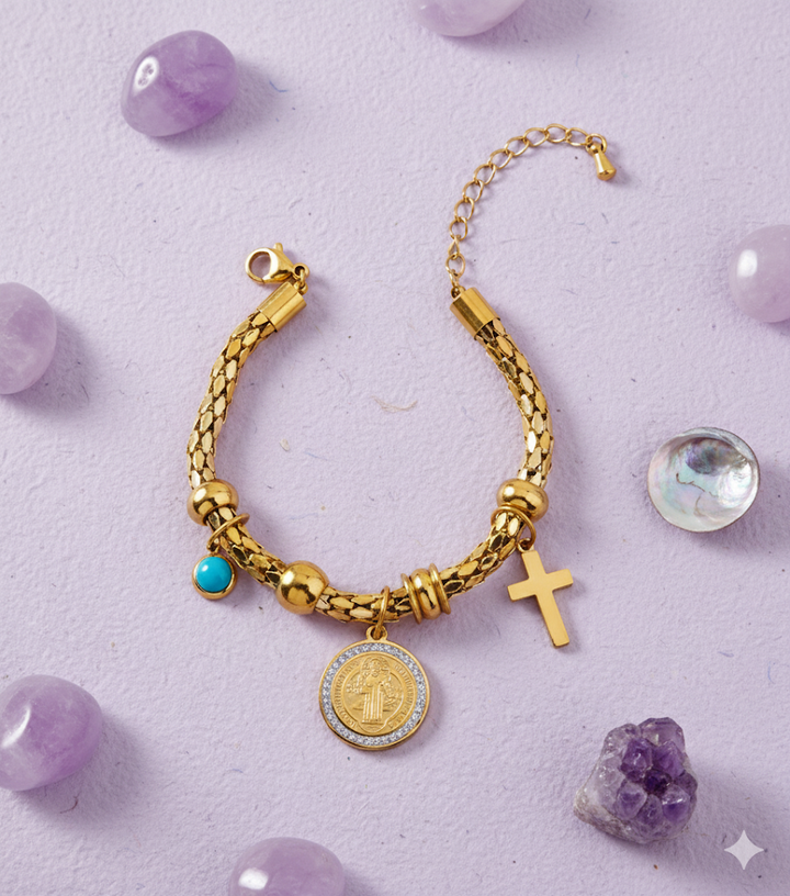 A bold bracelet with a slightly thicker chain adorned with coin-like charms, exuding confidence and style. Striking, playful, and effortlessly chic.
