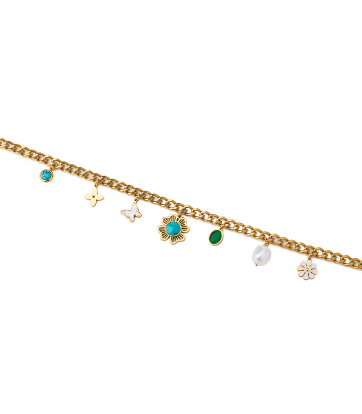 A playful and elegant necklace featuring a main flower-shaped charm with a blue bead, accompanied by delicate charms including a pearl, butterfly, flower, and jade-shaped pendant. Its mix of motifs creates a whimsical, nature-inspired look that’s perfect for layering or wearing solo. Adds a subtle pop of color and charm to any outfit.