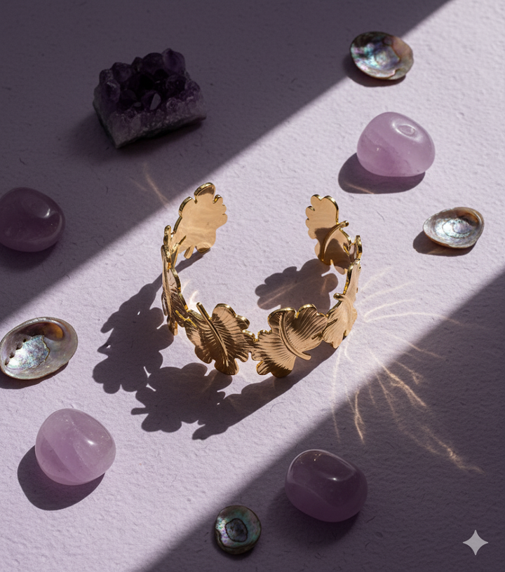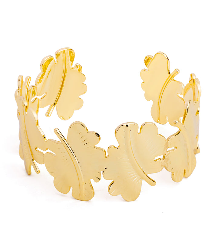 A bold bracelet adorned with graceful leaf patterns, a stunning statement piece. Subtle, and effortlessly charming.