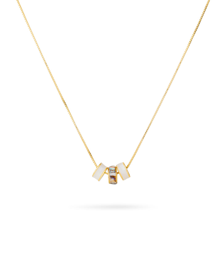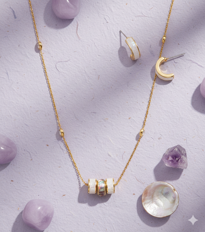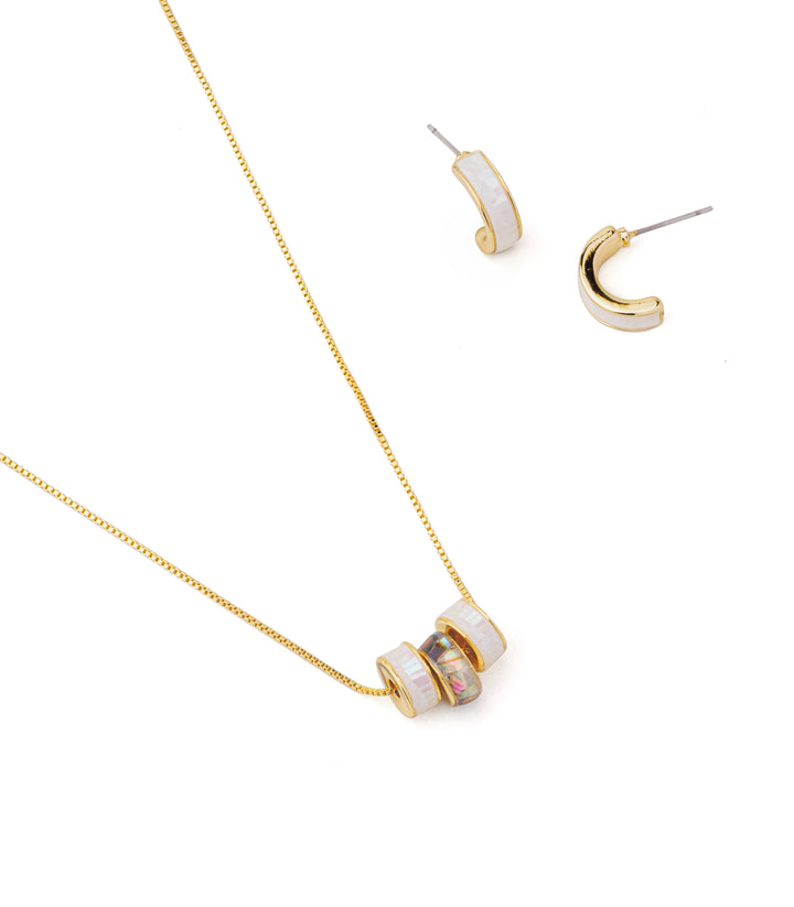 A graceful duo featuring a delicate necklace and matching earrings, adorned with soft white marble-inspired accents. Subtle yet striking, this set adds a touch of calm sophistication to both everyday outfits and elegant ensembles.