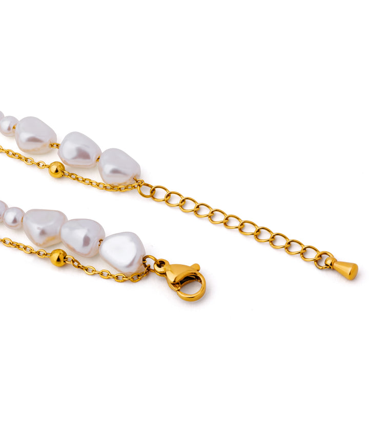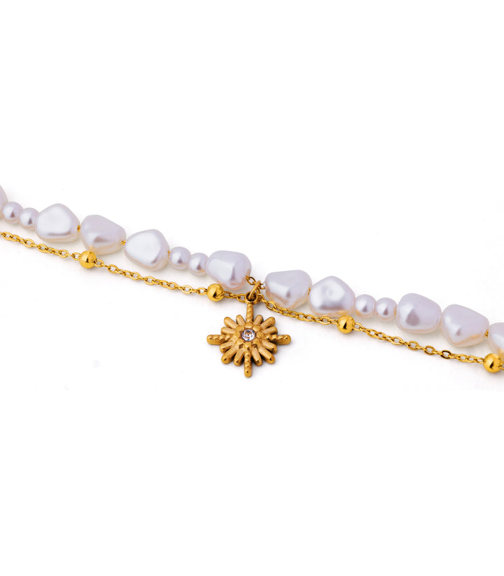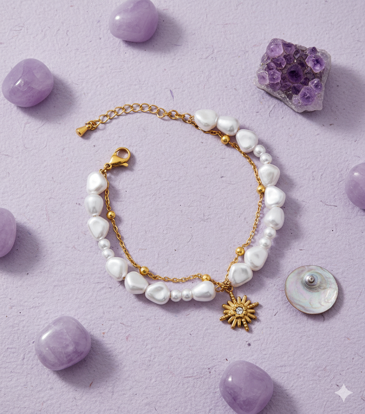 A delicate bracelet with pearly beads and a tiny sun pendant, radiating subtle warmth and elegance. Light, charming, and effortlessly whimsical.