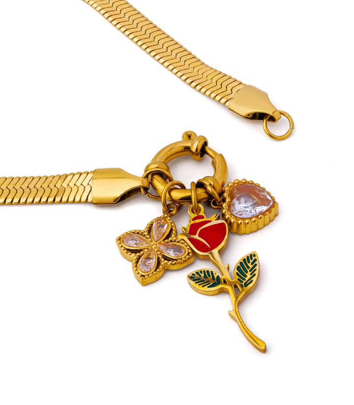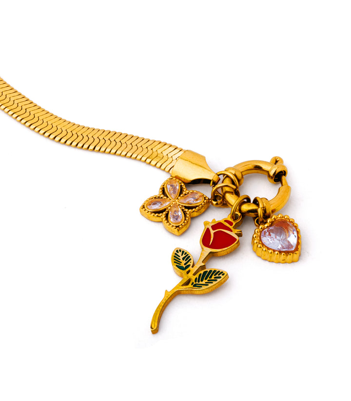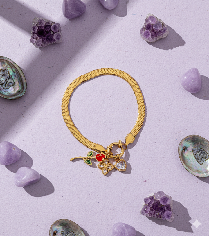 A delicate bracelet adorned with dainty rose charms, bringing a subtle touch of elegance and romance to your wrist. Graceful, charming, and effortlessly stylish.