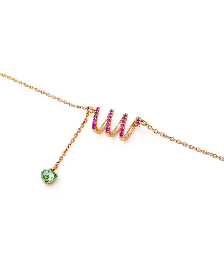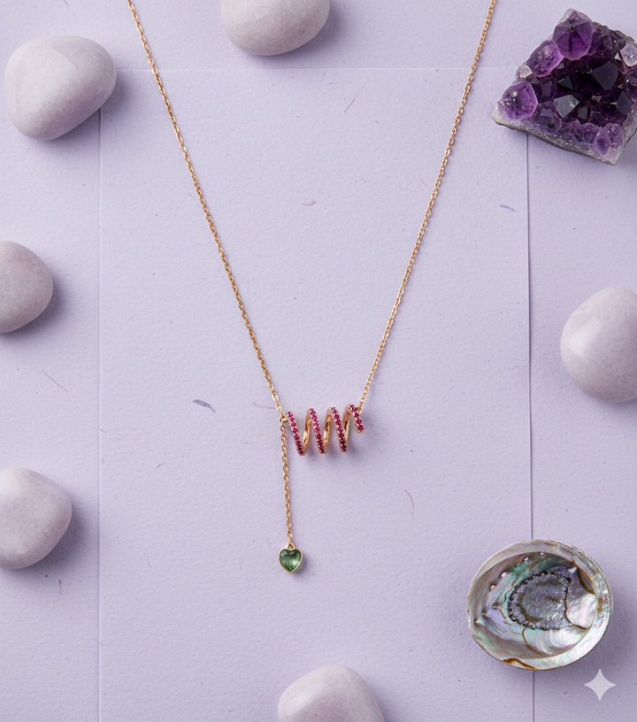 A unique necklace featuring a spiral design that beautifully frames a green heart pendant. Its blend of bold structure and soft color adds a modern yet romantic touch. Perfect for styling with minimal outfits to let the pendant stand out or layering with delicate chains for extra charm.