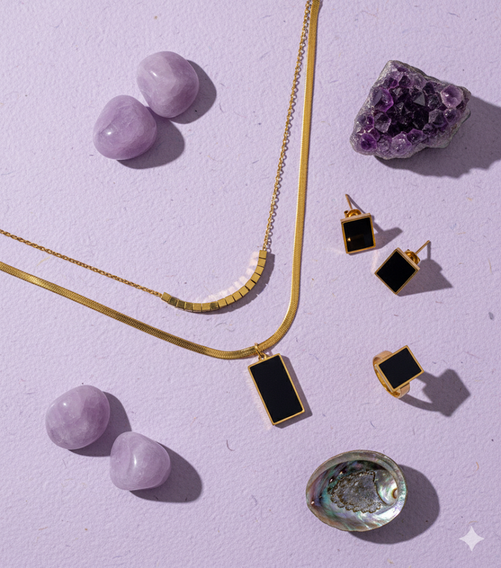 Experience timeless elegance with this uniquely modern jewellery set, crafted to merge classic gold shine with striking black accents. The set includes: