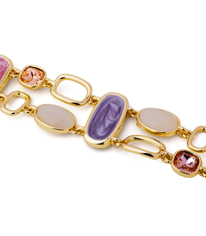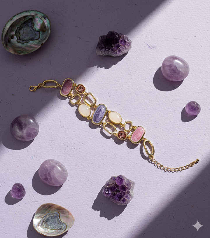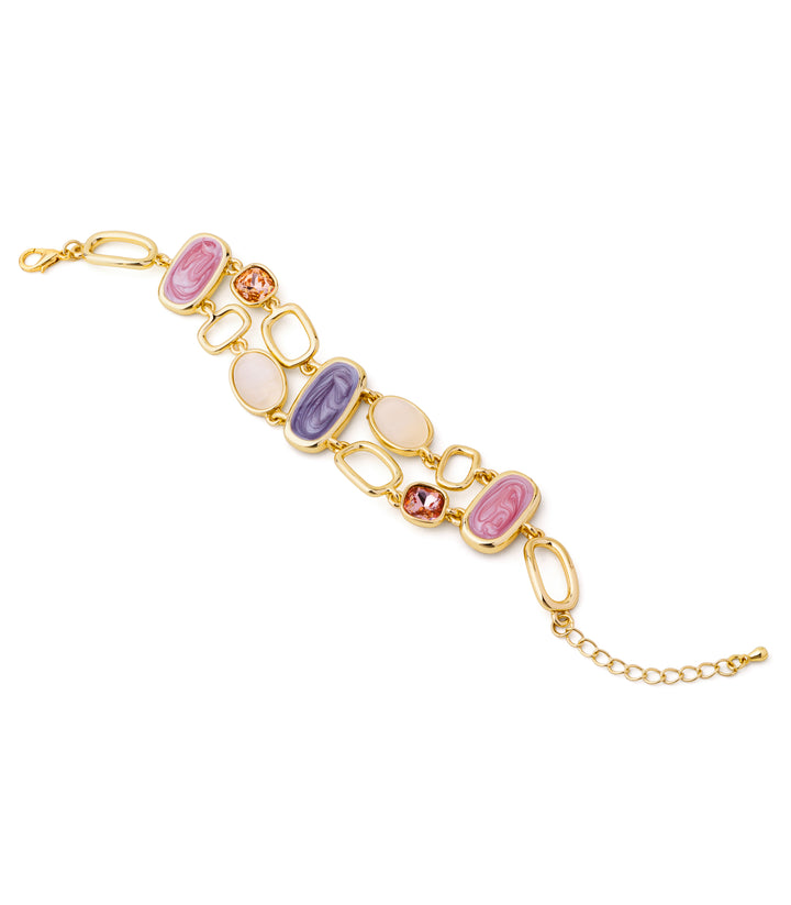 A delicate bracelet featuring multi-colored stones with a subtle swirling cat-eye effect. Unique, graceful, and effortlessly elegant.