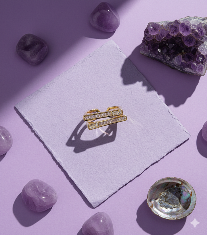Add a touch of modern sophistication with this elegant double bar gold ring. Featuring two parallel gold bars encrusted with shimmering stones, its contemporary open-band design exudes minimalist charm and architectural flair. The adjustable fit ensures comfort for everyday wear and effortless stacking with other favorites.