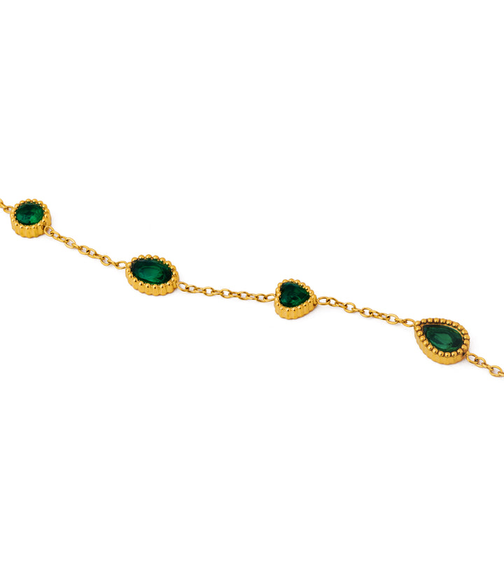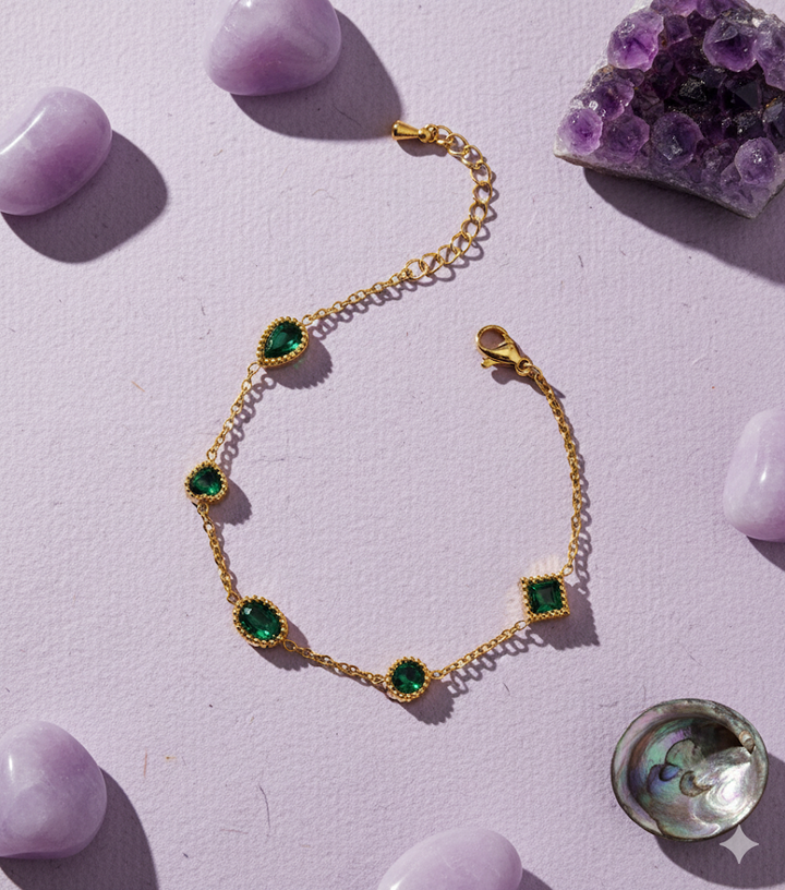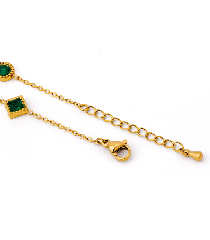Delicate gold chain adorned with tiny emerald charms, offering a subtle touch of luxury. Elegant, refined, and effortlessly graceful.