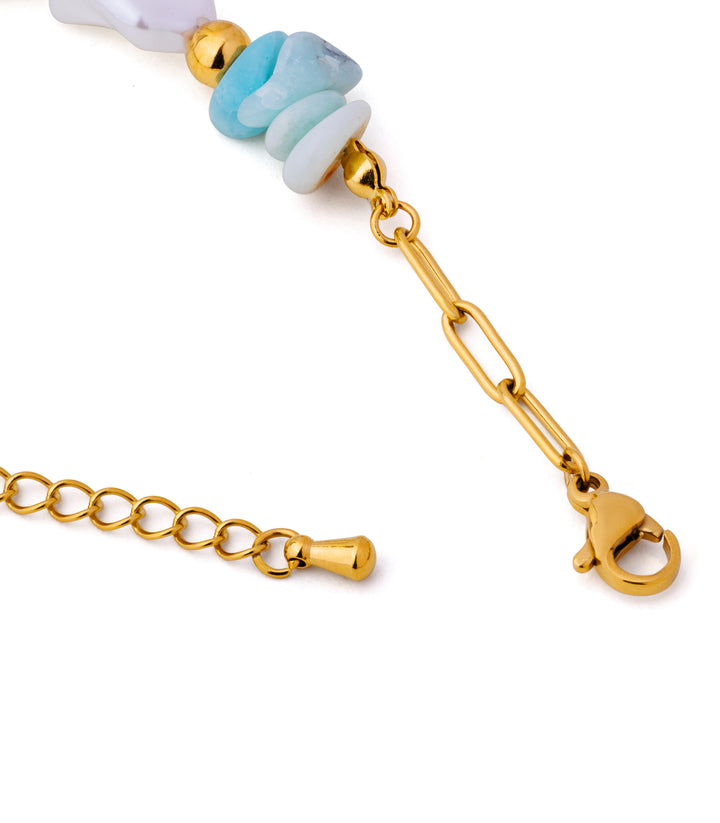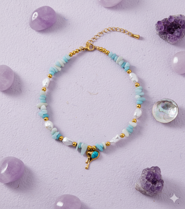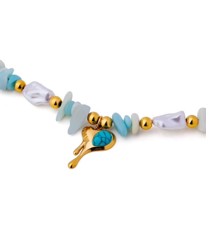 A whimsical bracelet with shades of blue beads evoking flowing water, centered with a melting heart charm. Playful, dreamy, and effortlessly charming.