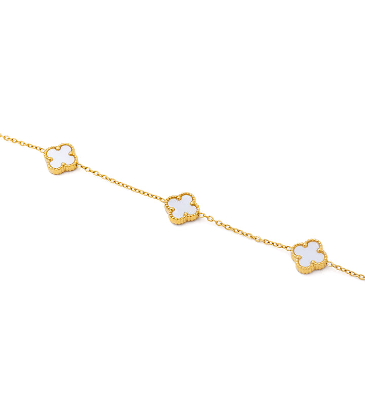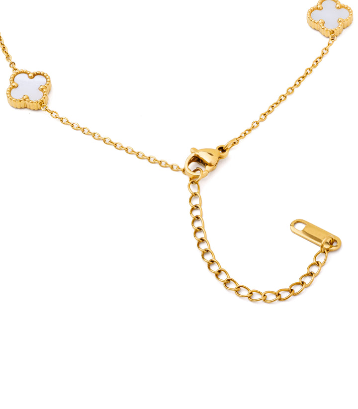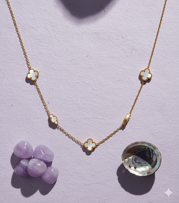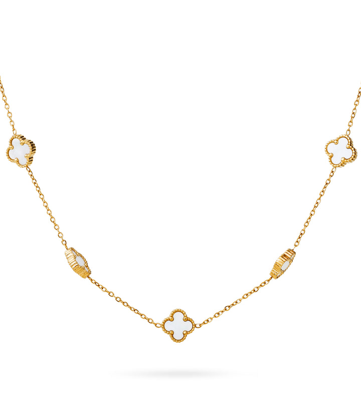 Enchant in timeless beauty with this clover station necklace, featuring luminous white mother of pearl motifs elegantly stationed along a delicate gold-plated chain. Each quatrefoil charm captures and reflects light, symbolizing luck, protection, and refined style with every shimmering movement.