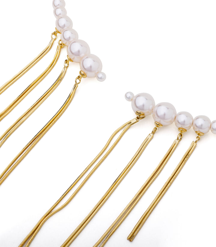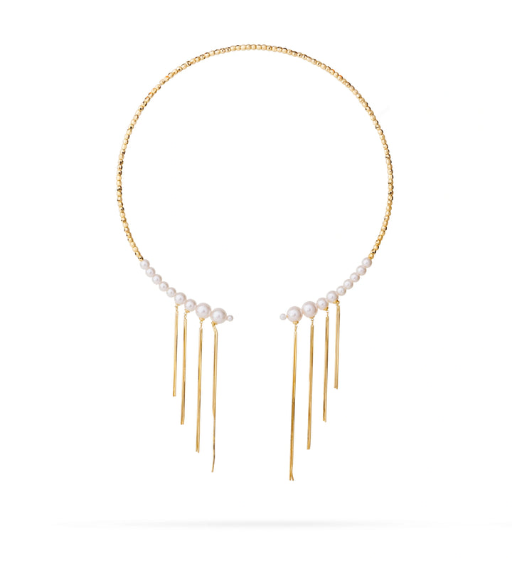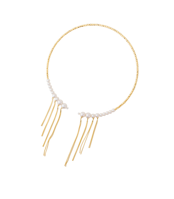 A graceful pearl cuff necklace accented with delicate golden strings dangling on both sides, adding a playful yet elegant touch, making it perfect for dressing up casual outfits or adding sophistication to evening wear. A versatile piece that brings charm and movement to any look.